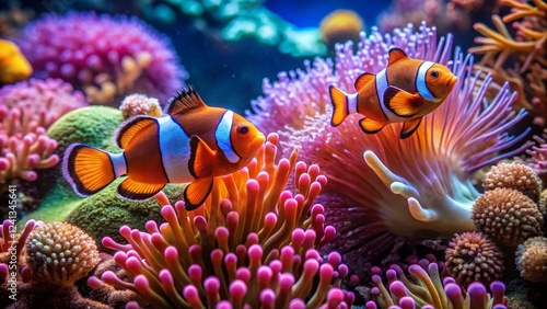 Vibrant Clownfish Swimming Among Colorful Sea Anemones Underwater