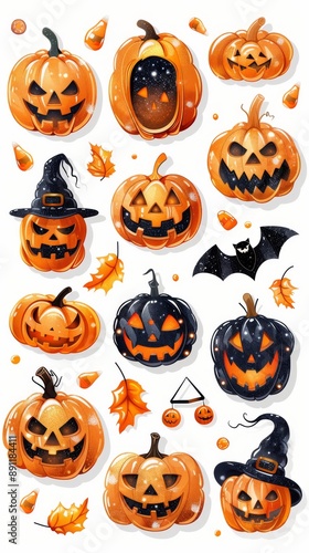 Vibrant Collection of Rhinestone Halloween Stickers Featuring Glittery Pumpkins, Bats, and Spiders on a Stark White Background