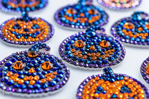 Vibrant Collection of Rhinestone Halloween Stickers Featuring Glittery Pumpkins, Bats, and Spiders on a Stark White Background