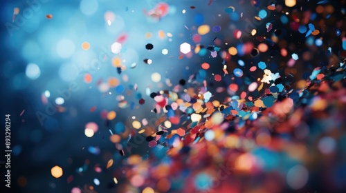 Vibrant confetti particles floating against a blue background, creating a festive and celebratory atmosphere.