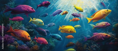 Vibrant coral reef scene with colorful fish swimming in a sunlit ocean.