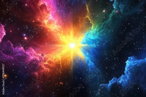 Vibrant cosmic explosion showcases colorful nebula and starlight in deep space