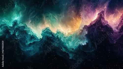 Vibrant cosmic nebula with swirling colors of teal, urple, and orange, creatin a mesmerizing celestial lndscape for imaginative prjects.