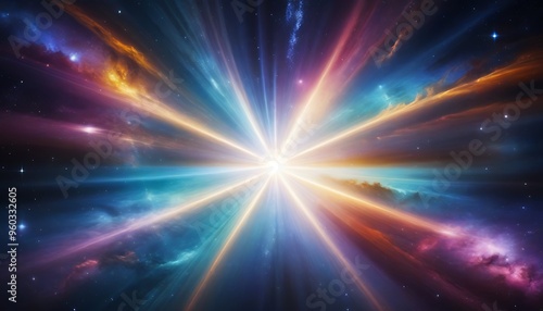 Vibrant cosmic scene with colorful light rays radiating from a central star, creating a mesmerizing galaxy effect.