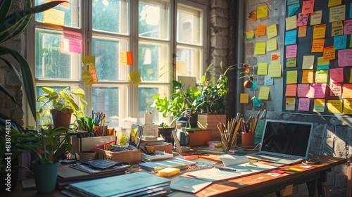 Vibrant Creative Studio Office with Colorful Sticky Notes and Art Supplies in Artistic Environment