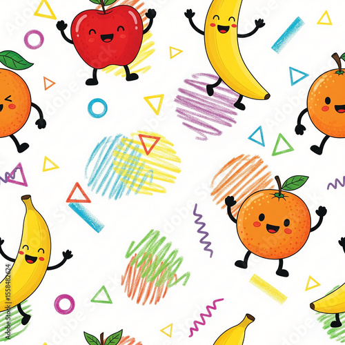 Vibrant Dancing Fruits with Abstract Crayon Scribbles and Geometric Shapes in a Lively Seamless Pattern