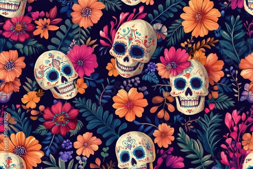 Vibrant Day of the Dead design with sugar skulls, flowers and plants on a dark background.