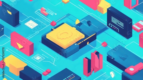 Vibrant digital illustration showcasing colorful tech elements and interactive designs in a modern workspace setting.