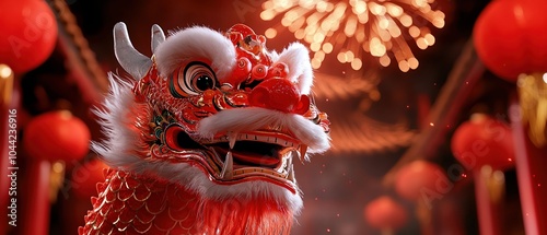 Vibrant dragon dance head with red decorations, festive atmosphere, fireworks, and lanterns in the background.
