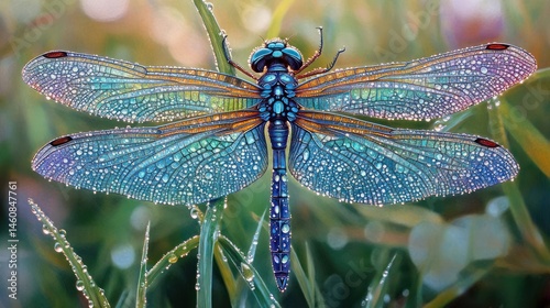 Vibrant dragonfly, adorned with dew drops
