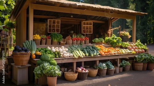 Vibrant Farm Stand Offering an Assortment of Freshly Harvested Seasonal Vegetables and Fruits in a Rustic Outdoor Marketplace Setting