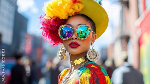 Vibrant Fashion Portrait of a Stylish Woman in Colorful Outfit with Bold Accessories