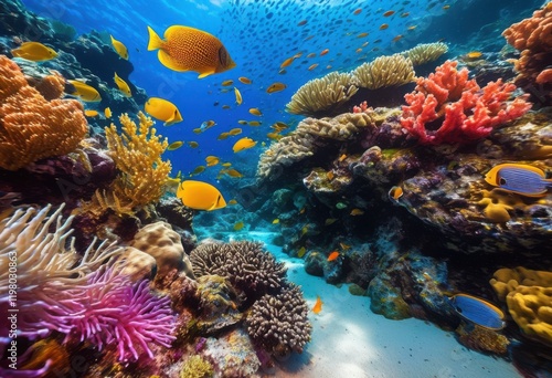 vibrant fish swimming through colorful coral formations underwater scene bright rich marine life diverse ocean ecosystem, reef, sea, aquatic, creatures, habitat