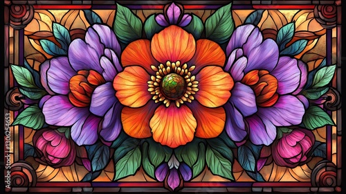 Vibrant floral arrangement glows warmly rich jewel tones create stunning stained glass aesthetic. AI Generated