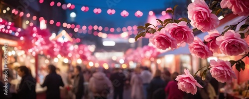 Vibrant flower festival at night featuring decorative lights and lively crowds enjoying local festivities in a charming market setting