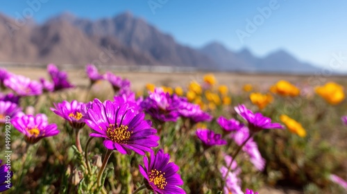 Vibrant flowers bloom in a desert landscape with distant mountains and clear skies