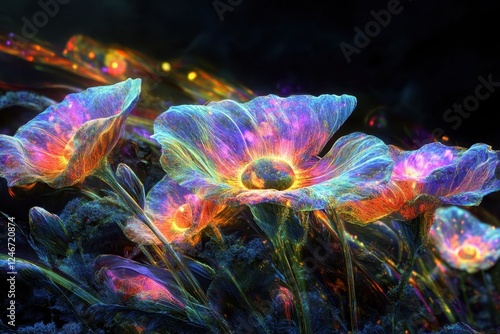 Vibrant flowers glowing in a surreal display of colors against a dark background