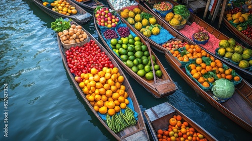 Vibrant Fruit and Vegetable Market Boats on a Calm River in Thailand