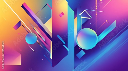 Vibrant geometric composition with dynamic shapes on colorful background