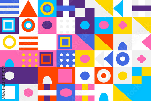 Vibrant geometric pattern with diverse shapes and bright colors, abstract background