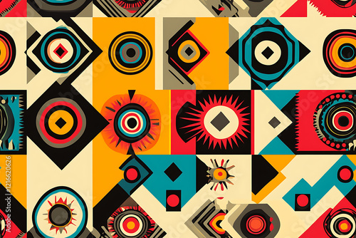 Vibrant geometric textile design; bold colors, concentric circles, and sharp shapes.