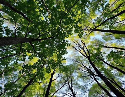 Vibrant green canopy viewed from below in a lush forest, creating a serene atmosphere.