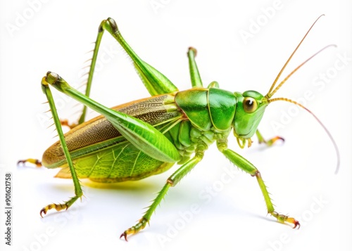 Vibrant green cricket with intricate wing veins and delicate legs isolated on a pure white background, showcasing its fascinating textures and natural beauty.