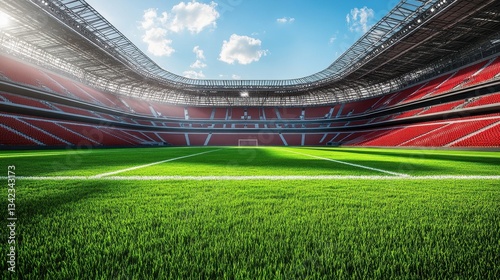 Vibrant green grass and red seats in a large stadium under a blue sky. Use it to show sports themes, competition, or the atmosphere of a big game.