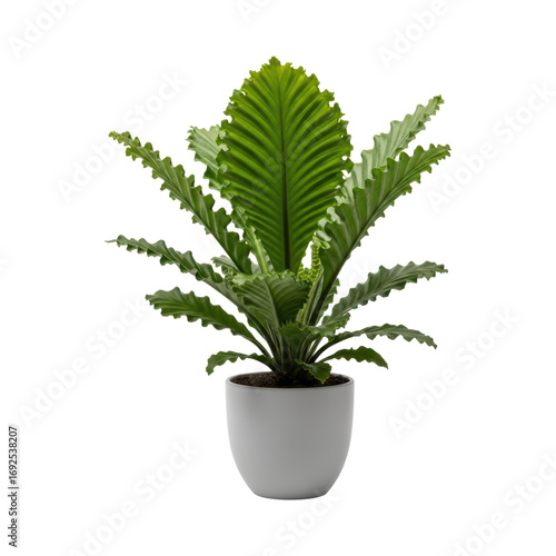 Vibrant green potted plant with wavy leaves in white planter on transparent background