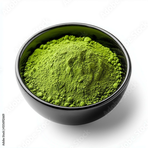 Vibrant green powder in a stylish black bowl, perfect for culinary uses or health recipes.