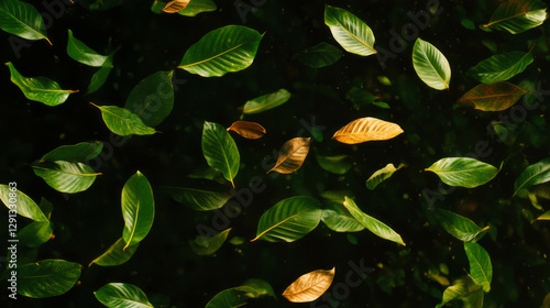Vibrant green tropical leaves falling gracefully for nature background design