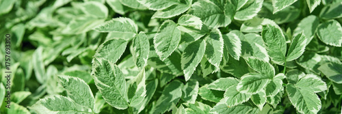 Vibrant green variegated foliage with sunlit leaves in a lush garden setting.