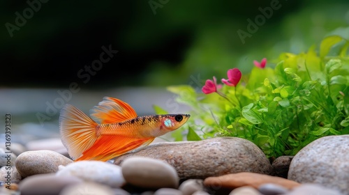 Vibrant Guppy with Colorful Snakeskin Pattern Swimming Gracefully Among River Stones and Aquatic Plants Under Gentle Nature Light