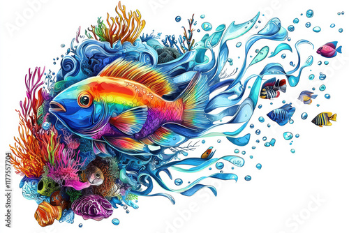 vibrant hand drawn illustration of rainbow fish swimming among colorful coral reefs