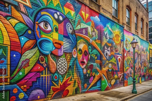 Vibrant hues of spray-painted graffiti art splatter across a worn urban wall, showcasing an eclectic mix of abstract shapes, playful patterns, and bold typography.