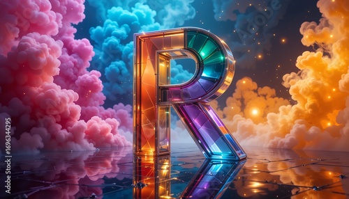 Vibrant illuminated glass letter r floating above reflective surface with colorful clouds background