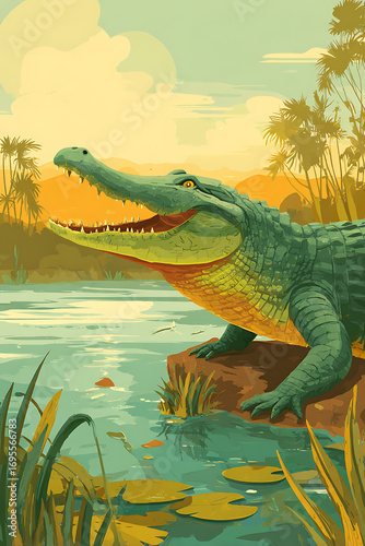 Vibrant illustration of a crocodile basking on a rock by a serene river at sunset