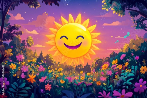Vibrant illustration of glowing smiley face sun shining over playful cartoon landscape