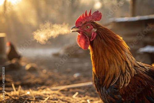 Vibrant Impressionist Cockerel Portrait in Warm Rustic Farmhouse Setting with Charming Details