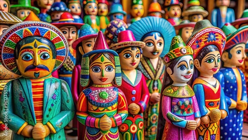 Vibrant, intricately designed Mexican artisanal wooden figurines, adorned with bright colors and patterns, stand together, showcasing traditional folk art and cultural heritage.