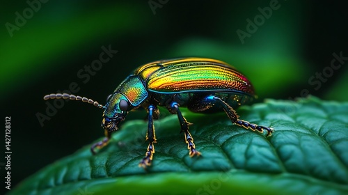 Vibrant jewel beetle resting on a deep green leaf iridescent exoskeleton reflecting the light extreme macro wildlife shot