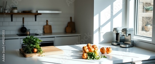 Vibrant Kitchen Counter with Fresh Fruits - Bananas, Oranges, and Cutting Board