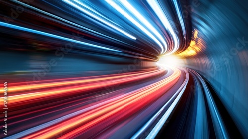 Vibrant light trails illuminate a tunnel, showcasing blurred streaks of color that suggest high-speed movement. orange glow at the end adds depth to this energetic scene