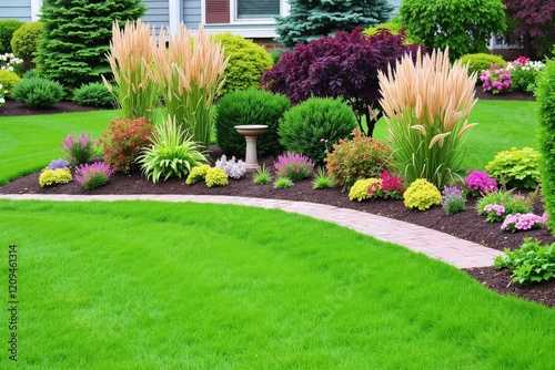 Vibrant Lush Garden Pathway with Colorful Flower Beds and Decorative Features in a Beautiful Landscape Setting