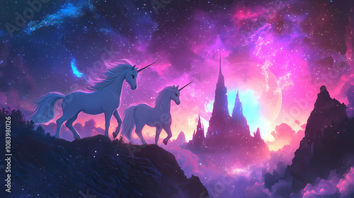 Vibrant magical unicorn creatures in a whimsical celestial fantasy landscape. Galactic. Illustration