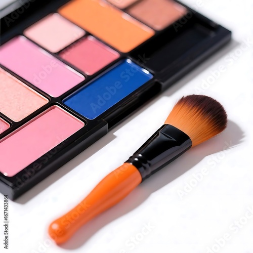 Vibrant Makeup Palette and Cosmetic Brush on White Background