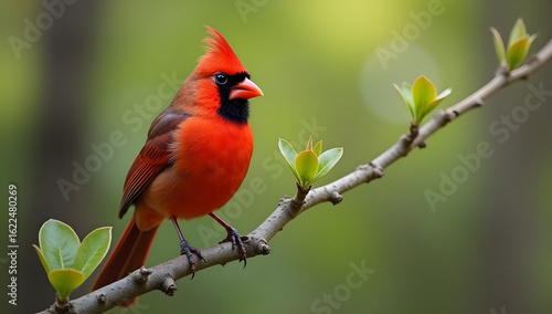 Vibrant male Northern Cardinal perched on a tree branch. Generative AI