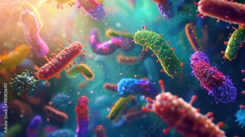 Vibrant microscopic view of diverse bacteria in a colorful environment, emphasizing the beauty and complexity of microbial life.