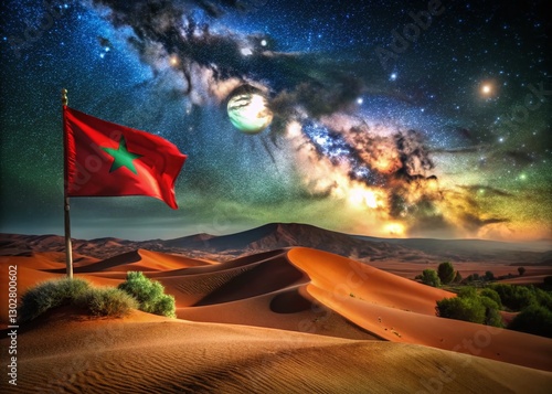 Vibrant Moroccan Landscape: Red Desert Dunes & Green Fields Under Starry Night