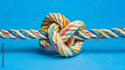 Vibrant multicolored rope tied in a complex knot against a solid blue background, representing challenge and complexity.